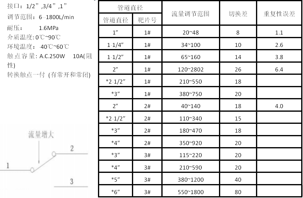 1.安裝前請仔細(xì)檢查流量開關(guān),包裝應(yīng)完整,外觀應(yīng)無損傷及變形。如有問題,請與生產(chǎn)廠家聯(lián)系;2.流量開關(guān)可安裝在水平管道或液流方向向上的垂直管道中,但不能安裝在也流向下的管道中。當(dāng)安裝在液流向上的管道中,用考慮重力影響。3.流量開關(guān)一定要安裝一段支線管道上,其兩邊至少5倍管徑的直線行程,同時(shí)應(yīng)注意管道中液流方向必須與開關(guān)外殼上的箭頭方向一致,其接線端子應(yīng)在易于接線的位置;(圖1)4.安裝接線時(shí),請注意以下事項(xiàng):*絕對禁止扳手碰撞開關(guān)底板,導(dǎo)致流量開關(guān)變形失效;*為避免觸點(diǎn)及損害設(shè)備,在接線或進(jìn)行調(diào)試時(shí),應(yīng)切斷電源;*接線時(shí),絕對禁止調(diào)節(jié)微動(dòng)開關(guān)接線端子,接地螺絲外的其它螺絲。并應(yīng)注意,微動(dòng)開關(guān)接線時(shí)不能用邊過猛,否則易使微動(dòng)開關(guān)本身位置移位,導(dǎo)致流量開關(guān)失效;*接線必須使用專用接地螺絲,不能隨意拆卸安裝螺絲釘,否則將導(dǎo)致控制器變形失效;*流量開關(guān)的靶片不能與管道內(nèi)壁及管道中其它節(jié)流器相接觸,否則容易導(dǎo)致開關(guān)不能正常復(fù)位。