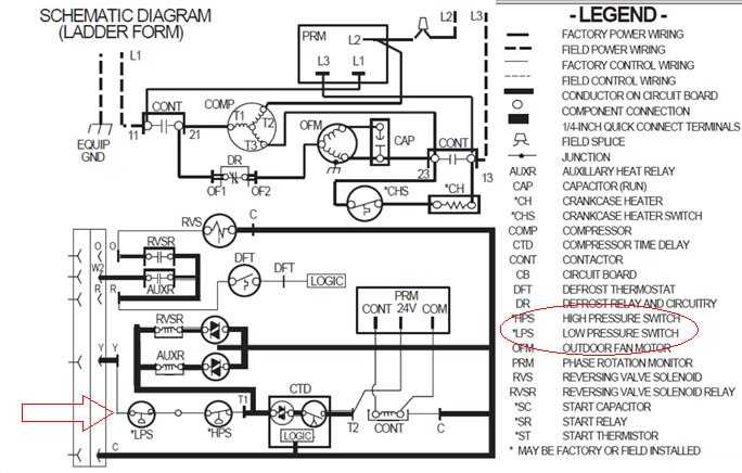 在下面的梯形圖邏輯示意圖中,您將在右下角看到一個(gè)紅色箭頭。紅色箭頭指向低壓開關(guān),低壓開關(guān)右側(cè)是高壓開關(guān)。這些壓力開關(guān)通過Y導(dǎo)線或端子連接到熱泵。在這種情況下,如果其中一個(gè)壓力開關(guān)跳閘,則該控制將終止整個(gè)冷凝裝置。遵循圖中接線的邏輯,Y線穿過壓力開關(guān),然后經(jīng)過壓縮機(jī)時(shí)間延遲。從時(shí)間延遲開始,邏輯跟隨壓縮機(jī)接觸器線圈。如果你停止壓縮機(jī)接觸器線圈的電源,你將殺死整個(gè)裝置。當(dāng)線圈斷電時(shí),壓縮機(jī)接觸器接觸打開。如果其中一個(gè)制冷壓力開關(guān)打開會(huì)發(fā)生這種情況。
