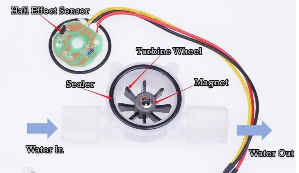 內(nèi)部非常簡單。主要組件是霍爾效應(yīng)傳感器,渦輪機葉輪和磁體。水通過入口流入,然后通過出口流出。水流帶動車輪轉(zhuǎn)動,車輪上的磁鐵也隨之轉(zhuǎn)動。磁場旋轉(zhuǎn)會觸發(fā)霍爾傳感器,該霍爾傳感器輸出高電平和低電平方波(脈沖)。