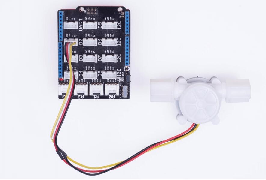 適用于基于Arduino UNO和Seeeduino V4.2的基于Atmega 328的主板。有兩個數(shù)字引腳可以用作中斷。數(shù)字引腳2用于中斷0,數(shù)字引腳3用于中斷1。在本博客中,我們使用D2引腳檢測水流傳感器輸出的脈沖。如果您使用的是Seeeduino + Grove基座護罩,只需將水流傳感器插入D2連接器即可。如果您正在使用其他Arduino開發(fā)板,請使用跨接電纜連接到正確的引腳。