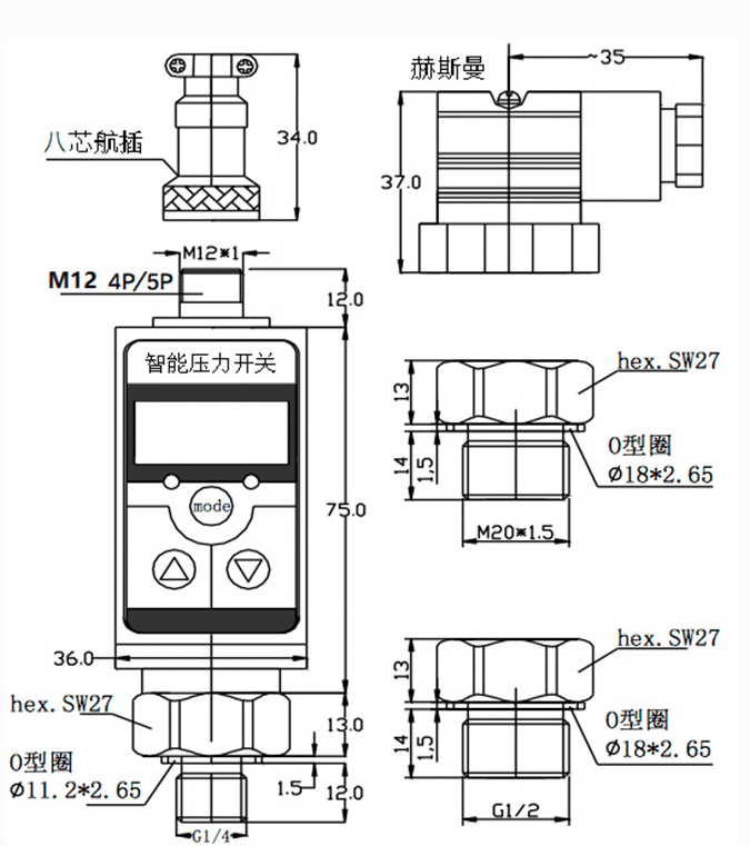 △ 全程: 詳見選型表△ 過載能力: 詳見下表 △ 開關輸出: 設定范圍 05%......100%量程 準確度 0.5%量程 開關數(shù)量 1或2個可選 輸出功能 PNP; NPN常開+常閉 接點鍍金 額定電流 ≤300mA 響應時間 ≤30ms △ 模擬輸出 : 輸出類型 ≤4...20mA 模擬量輸出 負數(shù) ≤500; 準確度 0.5%量程 △ 重復性: 0.5%量程 △ 顯示: 紅色9mm LED, 范圍 -999....9999 △ 電源: 15....30V DC △ 電氣保護: 反極 ,過載,短路保護 △ 環(huán)保溫度: -20.....80 △ 介質(zhì)溫度 -30....100 △ 儲長溫度 -40....1000 △ 溫度影響 <±0.03%FS/K △ 防護等級 IP67 △ 過程連接 不銹鋼+NBR密封 △ 外殼材料 鋅合金 △ 電氣連接 M124芯接插件 M125芯接插件(用于 1模擬量+2開關量型)